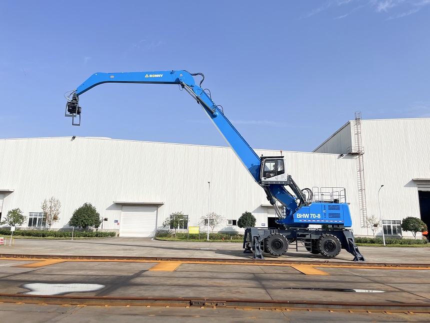 BHW70轮胎式港口码头抓钢机适用于钢厂料场装卸废钢、装卸火车皮物料、港口码头装卸物料,废钢等,具有以下特点: